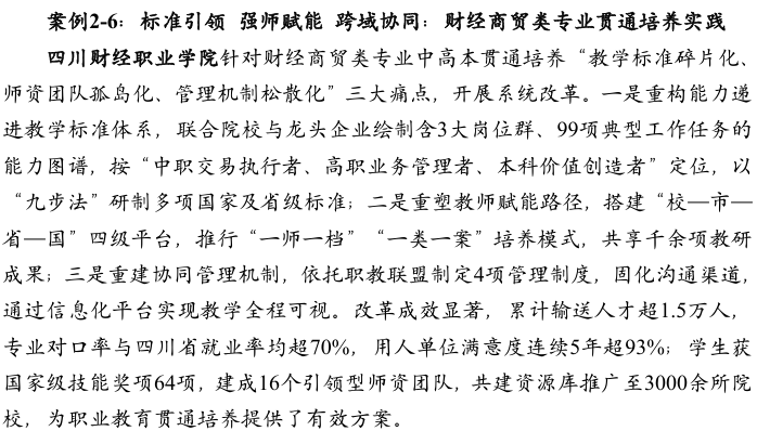 近日,《四川省职业教育质量报告(2025年度)》正式发布,由学院院长李代俊教授牵头,岳秀敏、唐进等老师参与完成的教学成果《标准引领 强师赋能 跨域协同:财经商贸类专业贯通培养实践》被遴选为典型案例,在“聚焦‘成才有路’,打造纵向贯通的成长通道”专栏获重点推介。