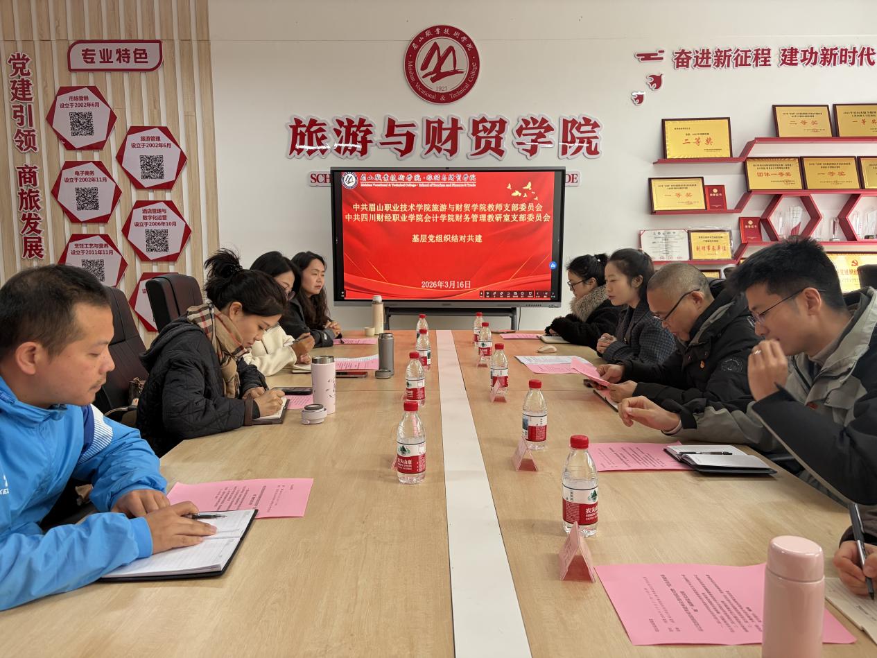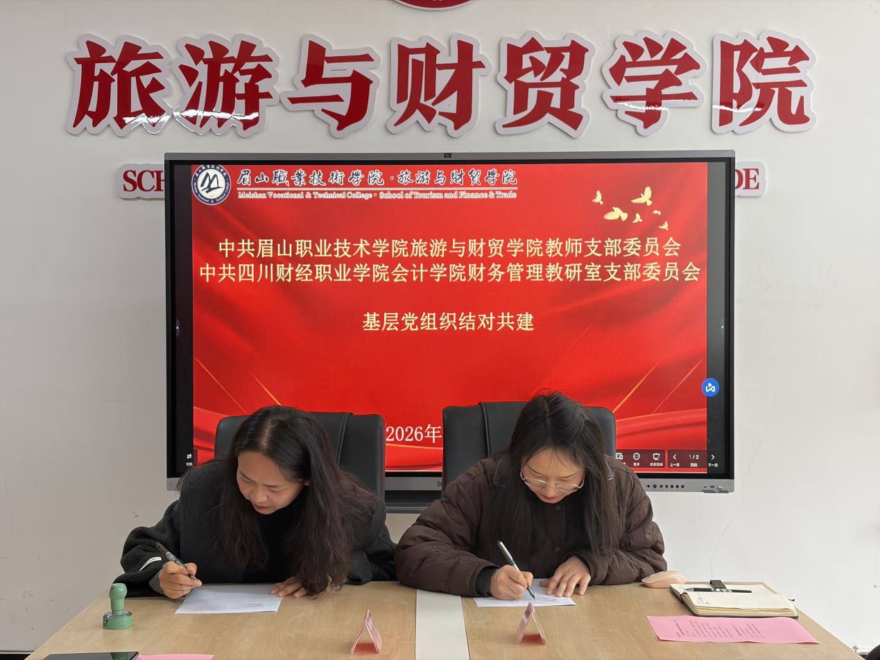 为深入贯彻落实习近平新时代中国特色社会主义思想,推动党建引领事业高质量发展,深化校际交流合作,2026年3月16日,四川财经职业学院会计学院党总支副书记张玮、专职组织员龚雪瑶、财务管理教研室党支部支委肖潇及郭海川一行,前往眉山职业技术学院旅游与财贸学院教师党支部共同举行党组织结对共建签约仪式。双方秉持“资源共享、优势互补、共同发展”的理念,正式签署为期两年的共建协议,开启了党建联建合作新篇章。