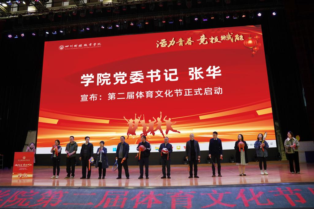 2026年3月24日,四川财经职业学院第二届体育文化节启动仪式在学校阳光体育馆举行。学院党委书记张华,党委委员、副院长钟用、罗潇、肖兆飞、李代俊出席仪式,各二级学院及相关职能部门负责人、师生代表共300余人参加。