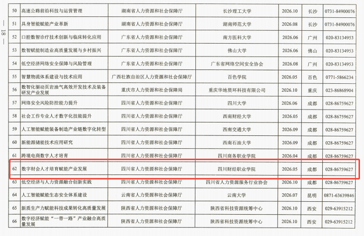 2026年3月31日,四川省人力资源和社会保障厅发布了《人力资源社会保障部办公厅关于印发专业技术人才知识更新工程2026年高级研修项目计划的通知》,四川财经职业学院申报的《数字财会人才培育赋能产业发展》项目成功入选该计划。