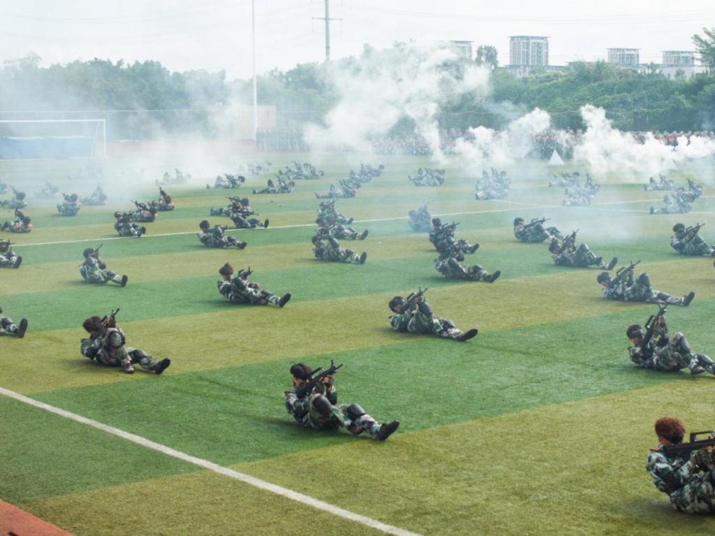 在战术汇报表演中,身着迷彩服的同学们手持模拟枪械,迅速进入“战斗状态”。随着指挥员一声令下,队员们交替掩护、匍匐前进,动作敏捷规范,战术配合默契十足;时而利用场地地形快速隐蔽,时而组成战术小组向 “目标” 发起突击,每一个战术动作都展现出应有的军事素养。