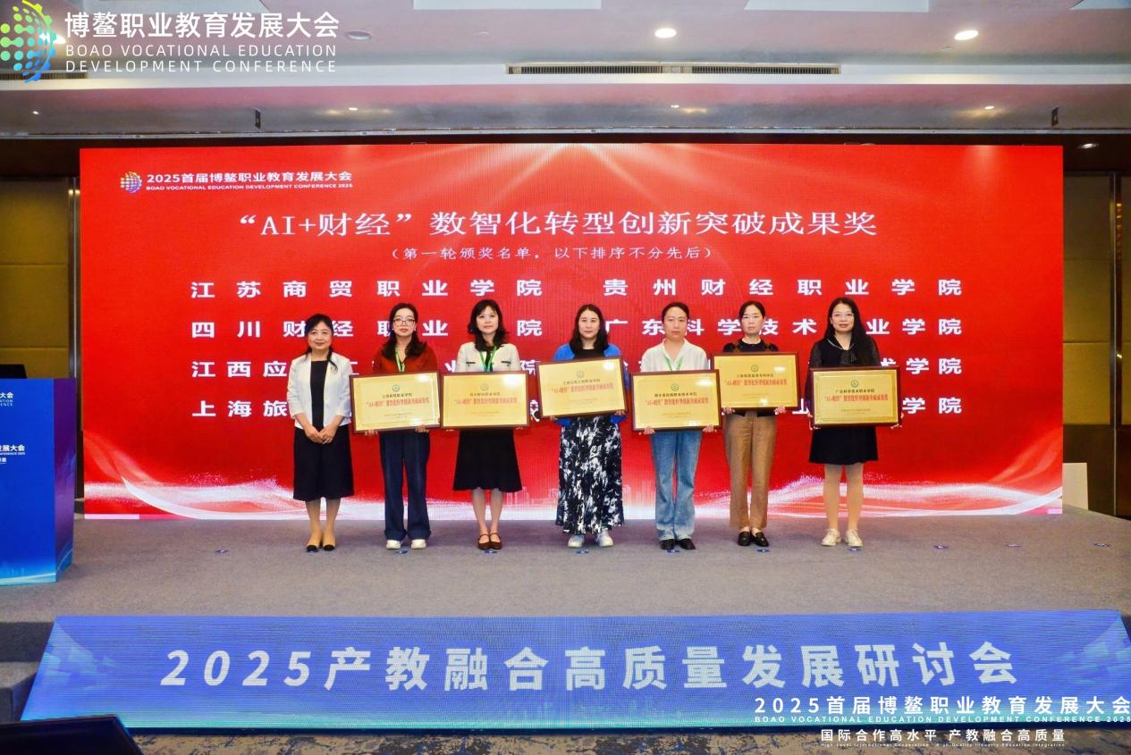 在随后举行的协同创新成果奖颁奖仪式中,我校荣获“AI+财经”数智化转型创新突破成果奖。罗艾代表学校上台领奖。该奖项是对我校在人工智能与财经教育深度融合、推动教育教学数字化转型方面取得成果的肯定,彰显了学校在产教协同与数智创新领域的示范作用。